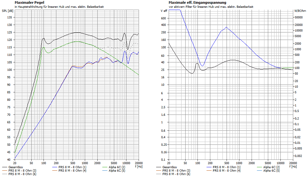 6 FRS , 180W -> 110,5 dB  ( nicht im Tief-bass , versteht sich, wegen dem max. Membranhub , 5mm max.)
