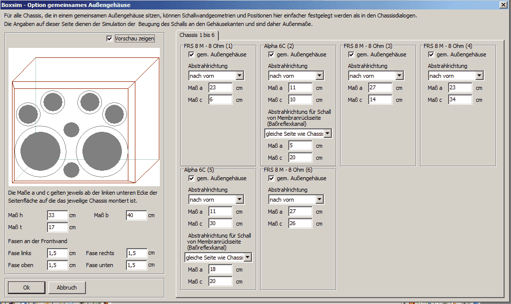 A: 15 l Box mit 6 x FRS8m . stereo, ca. 2 x 3 Ohm. / ergibt rund 180 cm² Membranfläche , is stereo und kommt ohne HT aus; ca 120W Musik sollten gehen....(bei88dB/1W) ca. 110 dB Enddruck.