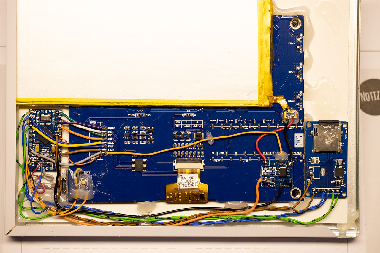 Bauteile stammen aus der Grabbelkiste: Arduino Micro, Micro-SD-Card Modul, P-fet, LiPo Zelle aus einem Tablet und usb-LiPo lader. Zusammen in ein Bilderrahmen eingebaut sieht das so aus: